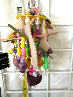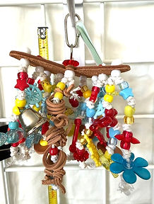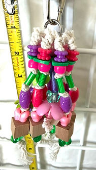 One plastic blue spin top holds nine knotted cotton ropes loaded with pony beads, tube beads, stars, a pink peanut, flowers. Nickel plated pear hook securely hangs this toy in your cage